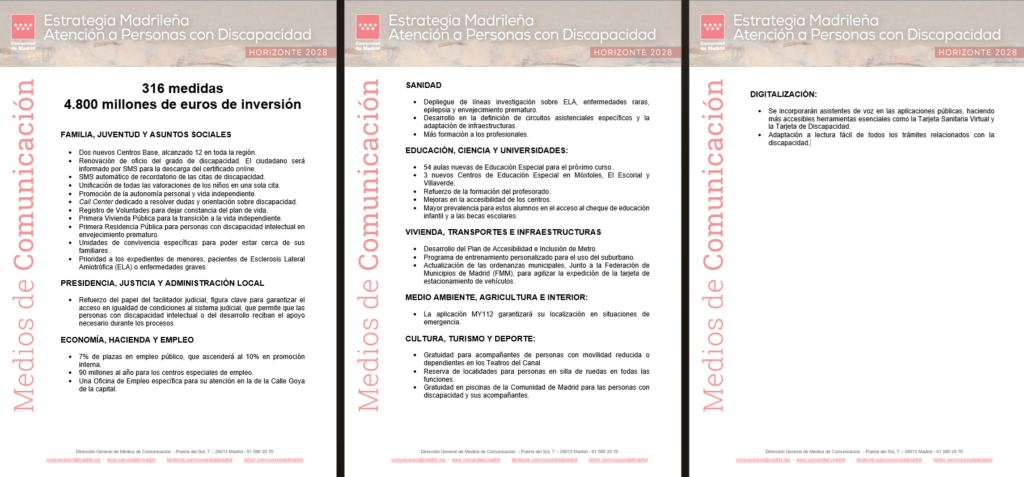 Y en el área de la cultura y el deporte, destaca la apuesta por una oferta accesible, facilitando, por ejemplo, que los acompañantes de personas con movilidad reducida o dependientes puedan entrar gratis en los Teatros del Canal,